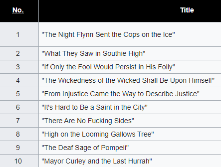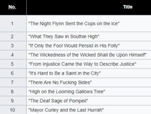 Just brutal. An average of 7.2 words per title! Am I wrong in thinking that episode titles should be 4-5 words max? Take Game of Thrones for example. Its best episodes, arguably, are “The Rains of Castamere”, “Hardhome” and “Battle of the Bastards”. All easily memorable. I find it hard to believe someone will remember that their favorite City on a Hill season 1 episode was “From Injustice Came the Way to Describe Justice”. But maybe that’s just me. (yes, I know that not all TV shows need to have recognizable episode titles, I’m just picking on COAH)