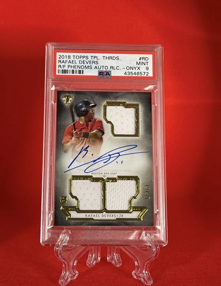 A 2019 Topps Triple Threads Rookie Future Phenoms on card autograph numbered to 35 of Boston Red Sox Rafael Devers! I got this on EBay two years ago at a steal. I love Devers and think he should be in a Sox uniform and get paid. This card graded as a PSA 9 Mint and I’m not complaining one bit!