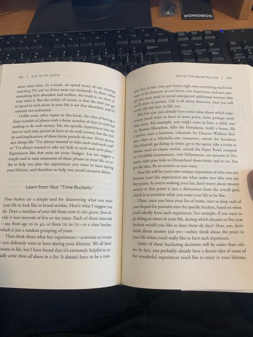 With regards to the Bucket List though, this year I read Die with Zero: Getting All You Can from Your Money and Your Life by Bill Perkins. I really enjoyed it and its message about living, saving, and spending your money. One of the biggest takeaways I got was the idea of swapping a bucket list for “Time Buckets”. He suggests drawing a “timeline of your life from now to the grave, then divide it into intervals of five or ten years. Each of those intervals is a time bucket.” Then you add your key experiences (activities or events you definitely want to have during your lifetime) and drop each of them into specific buckets. And don’t think about money, just about the point in your life when you’d like to have each experience. You’ll start to realize that some of these are better done at certain ages. A number of experiences are limited as we age, and our health declines, so it’s important to really consider when in our life a certain experience or activity can best be done.