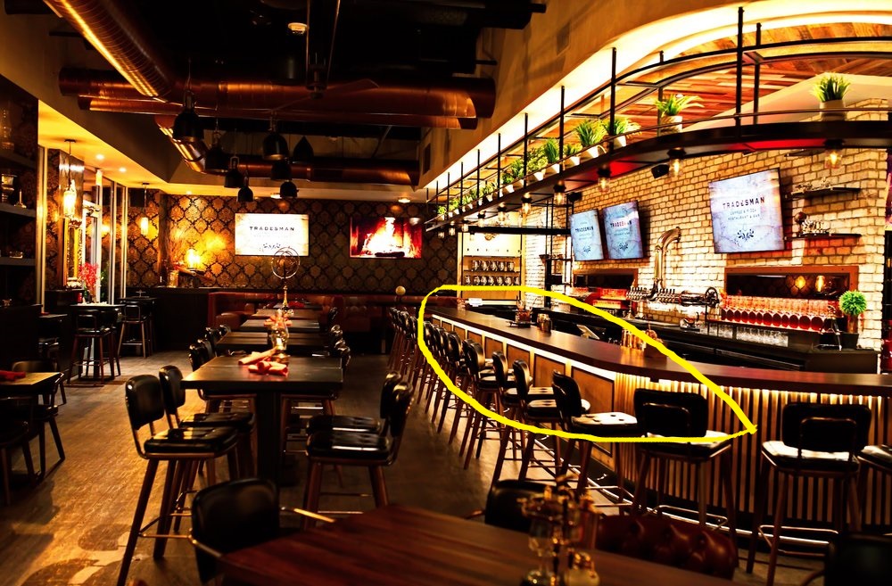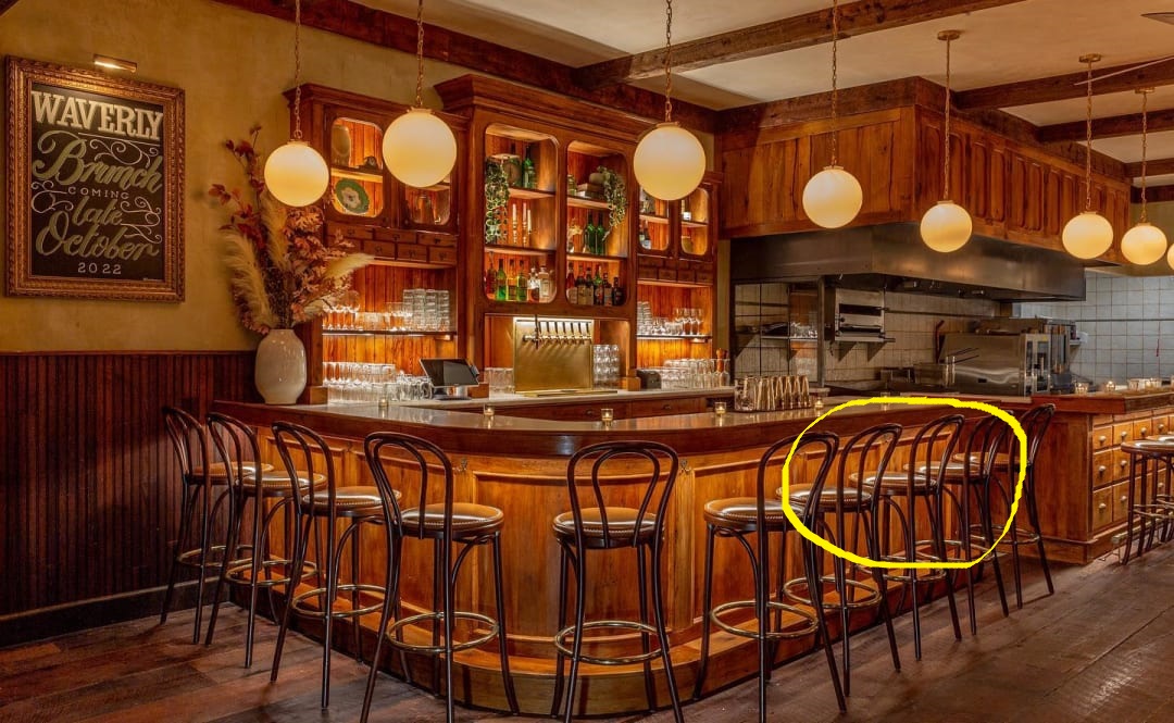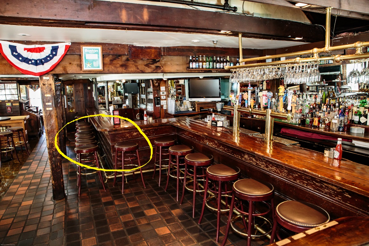 This is Charlestown’s newest bar and the one that’s closest in distance to me (right around the corner)! It’s a pretty small bar, but if I was able to pick where I sat, it would be at the three chairs I circled above. The entrance is kind of right at the corner of the bar, so I don’t love being there. The seats to the far left and just too tucked in for my liking, and the very last seat on the right is next to a walk-thru for bartenders and servers. BTW, shout-out to Gil at the bar who makes a great espresso martini!