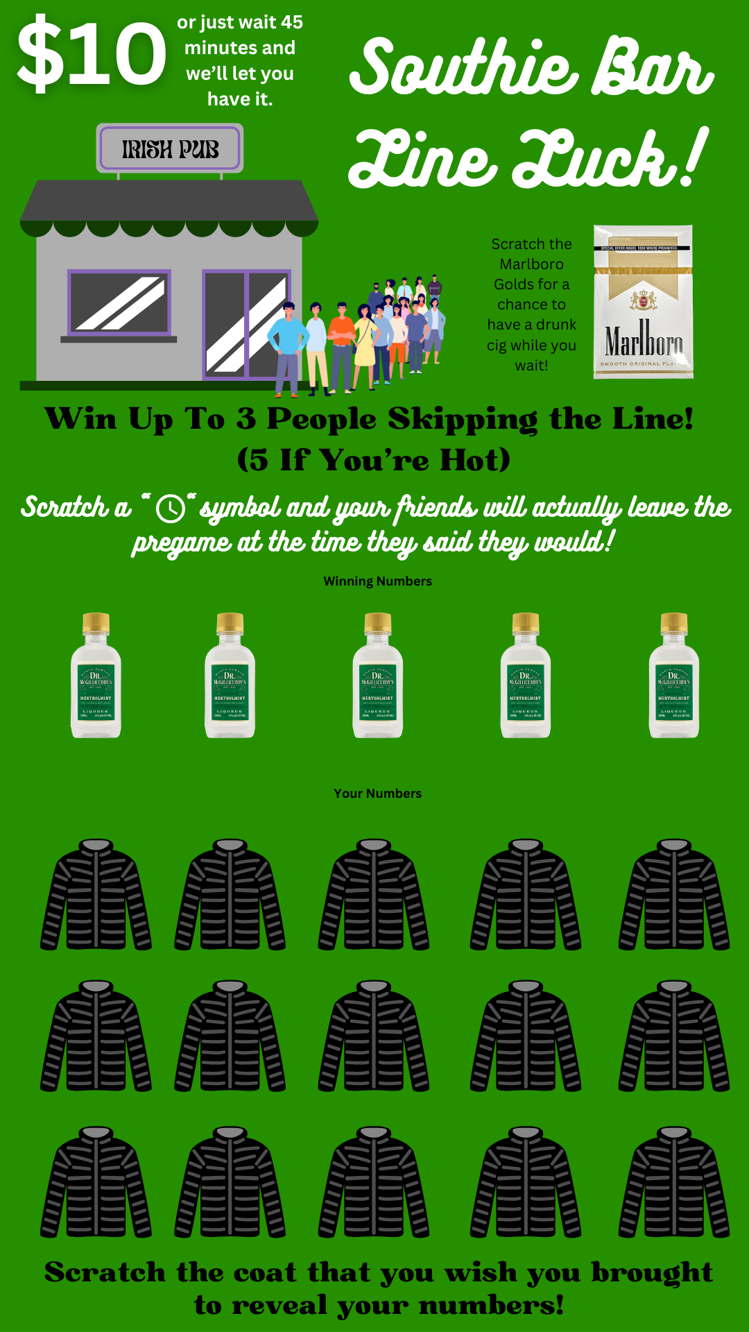 Waiting for 45 minutes to get into Lincoln, where you can’t hear the music and it’ll take you 20 minutes to get an overpriced espresso martini, is one of Boston’s greatest pastimes, but there’s a price to pay. This scratch ticket will make that price a little bit easier though! Scratch off those coats that you wish you ended up bringing for the freezing wait outside and you might could win: a direct pass into the bar (if you’re hot), a McGuillicuddy’s nip to keep your buzz alive, a smooth Marlboro Gold to take the edge off, or best of all, you could have your friends leave the pregame when they actually said they would and miss the line all together!