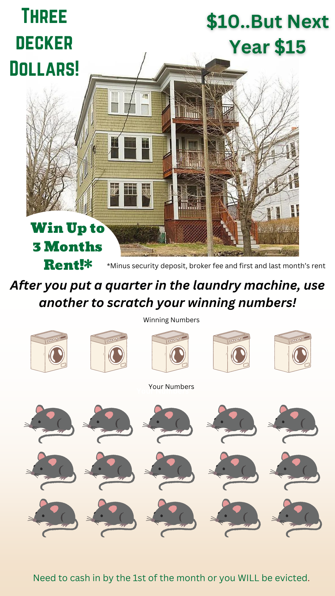According to Rocket Mortgage, Boston is the #6 most expensive city to live in in the U.S. So if someone wins big on a scratchie it’s safe to assume they’d spend it on their monthly rent. So why not have a scratch ticket themed around Boston’s famous triple deckers! Make sure to cash it in as soon as you win, or else the price of a ticket will go up. Thank God you have an in-unit (but coin-operated) laundry so that you can use those coins you’ve been saving up to scratch off this ticket! If you scratch off a winning number under those mice, you be able to afford an exterminator to come and take care of the real life mice in your apartment!